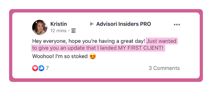 "I signed on my 3rd customer (in less than one month) after following the Advisori Insiders Pro program! A big THANK YOU to Anna + her team for helping my dreams come true.
